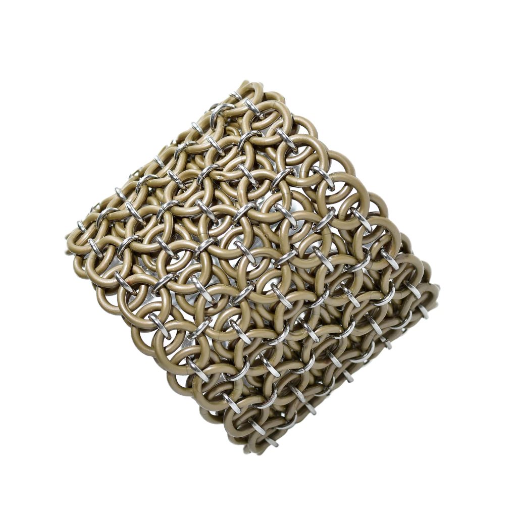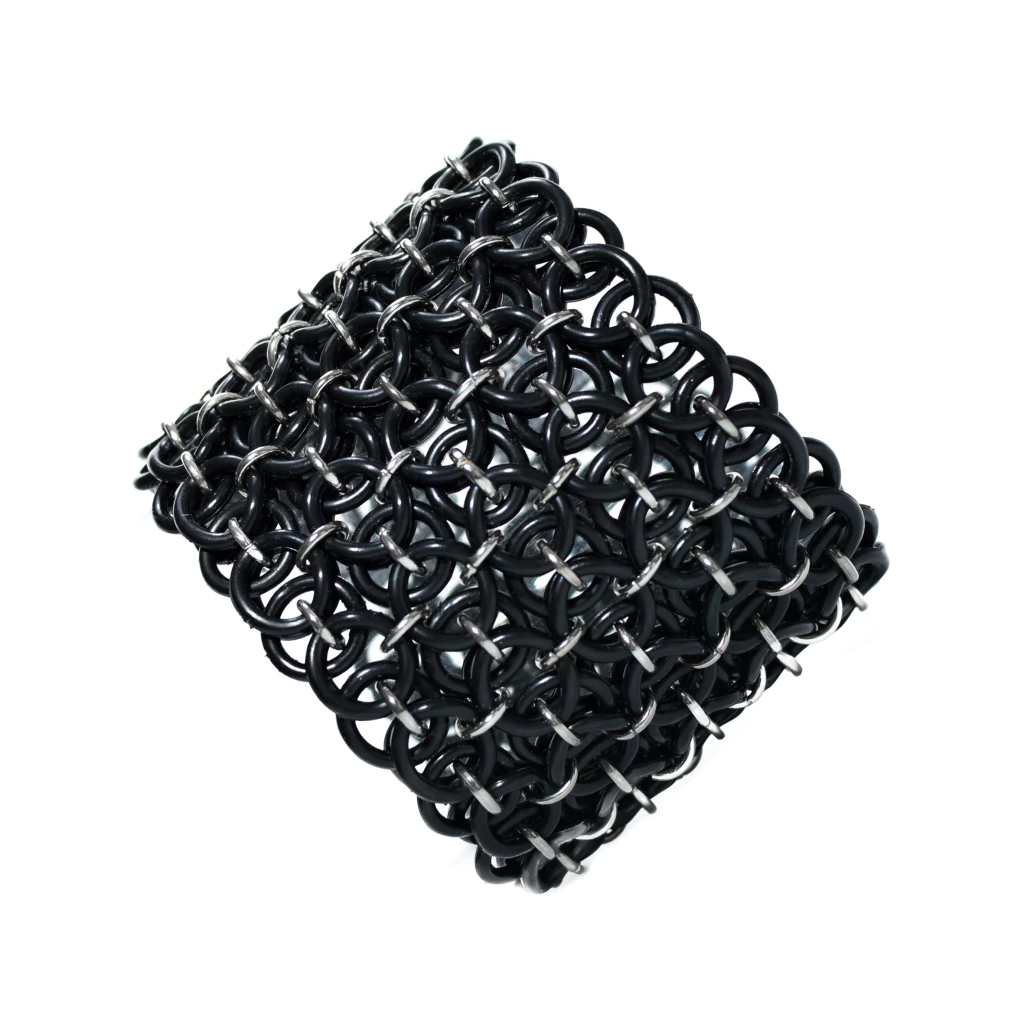 Pieza realizada con anillos plásticos reutilizables- fabricados exclusivamente para nuestra marca- y argollas de aluminio anodizado. Posee terminaciones de cuero. Hecho a mano. Medidas: 20 cm de largo y 6 cm de ancho.