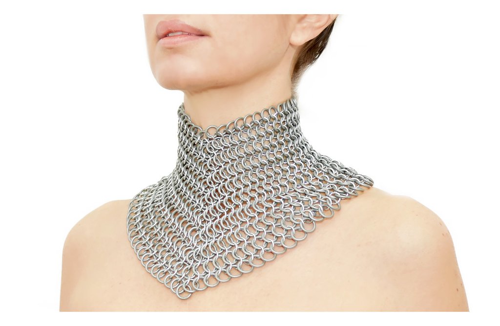 Cuello realizado con anillos plásticos y argollas de aluminio, con broches imantados, hecho a mano.