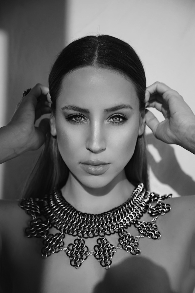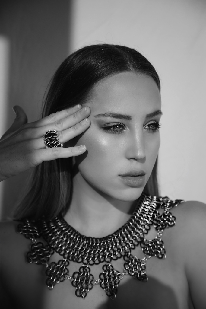 Pieza entera, elastizada, realizada con anillos plásticos y argollas de aluminio, hecha a mano.