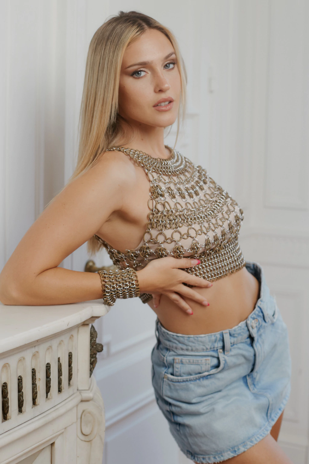 top realizado con anillos plásticos reutilizables (que fabricamos exclusivamente para nuestros accesorios) unidos con argollas de aluminio anodizado, utilizando una técnica de tejido medieval. La pieza es ultraliviana, realizada totalmente a mano.